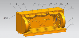 本发明为一种纯机械式绿色吸尘黑板擦,该发明可广泛适用于各种需要粉笔书写的场合,具有广大的市场前景。且本发明仅仅使用简单的齿轮传动,将擦黑板时黑板擦与黑板间的切向摩擦力转化为风扇旋转的动力,从而达到吸尘除尘的目的。该发明结构简单,无其他动力源(如电力),是真正的纯机械式绿色无污染黑板擦。