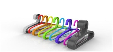本实用新型以巧妙合理的结构,减少了衣架存储时占用的空间,使衣架不会脏、乱,颜色的运用能够帮助使用者迅速找到空闲衣架,做到了人性化的设计。